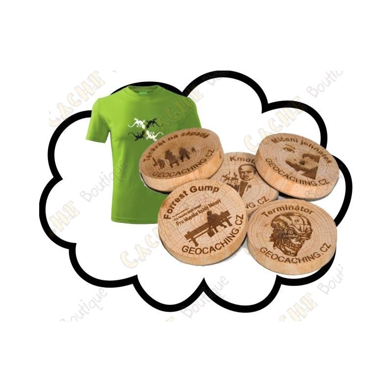 1 T-shirt + 50 Wood coins with your own design.